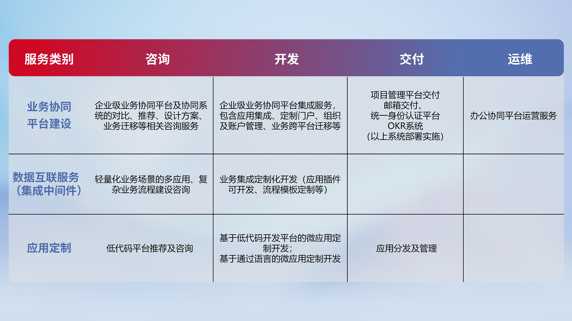 针对钉钉、、、、企微、、、、IDaas等平台级产品提供产品的规划、、、方案、、、交付、、、、定制化开发等服务,,,,实现如统一协同办公、、智能客户服务、、、、混合会议管理、、智能数据查询、、等业务场景,,,实现数字化转型。。。。